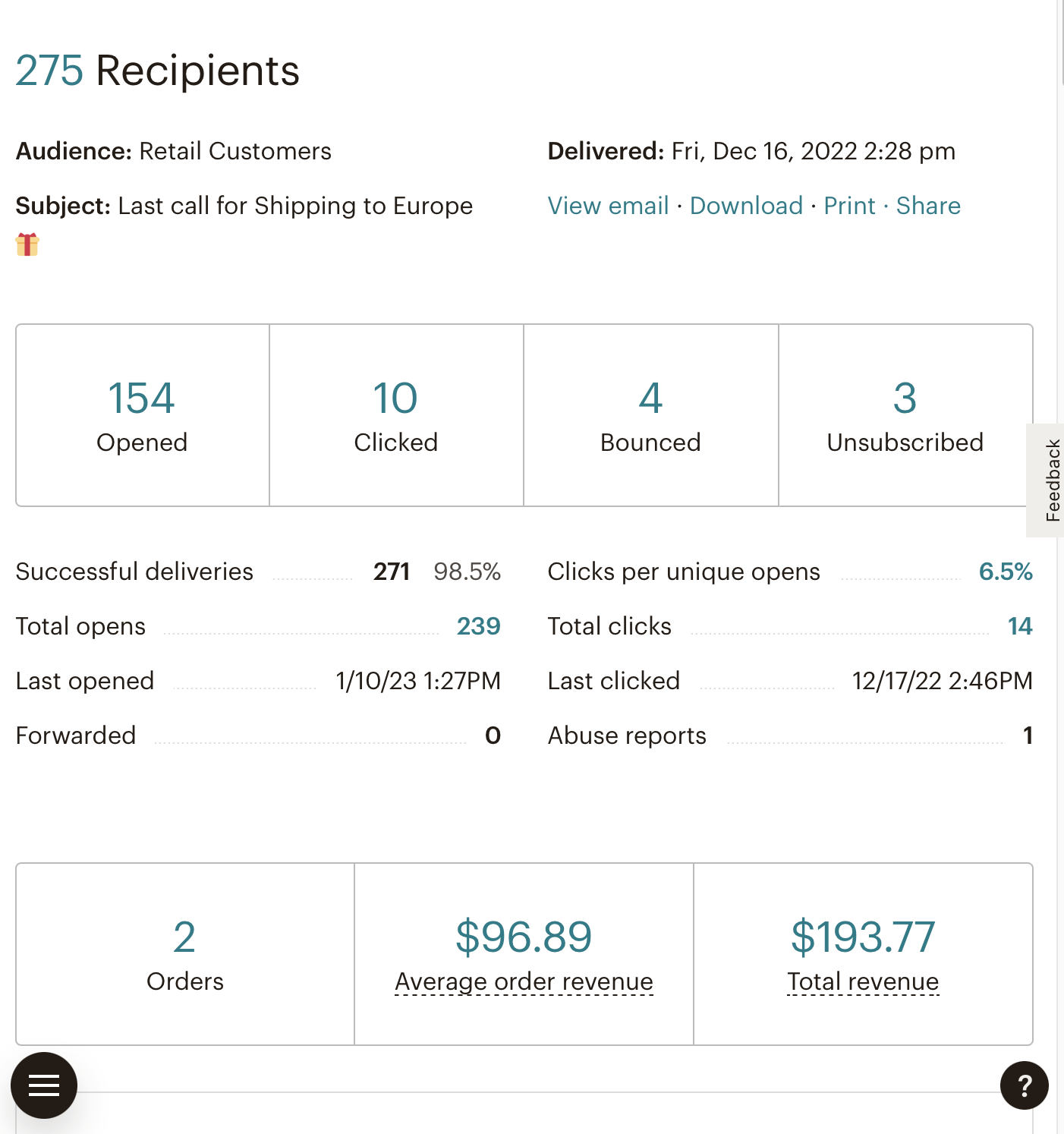 275 contacts, an average of 61% open rate and an 11% Click to Open Rate