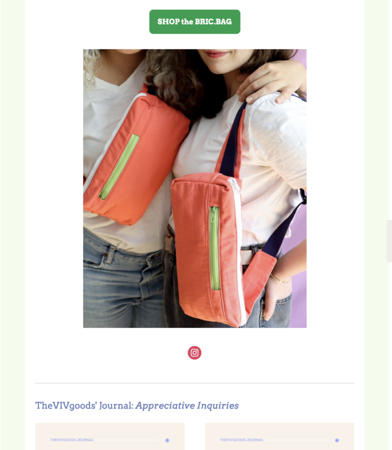 As a former freelance graphic design and brand developer it was a treat to design TheVIVgoods brand style guide. The brand is a little sporty, a little funky with touches of vintage-cute, and “weird aunt”. The logo is hand drawn and looks almost like a signature – a reminder that TVG is “personal-brand adjacent.”